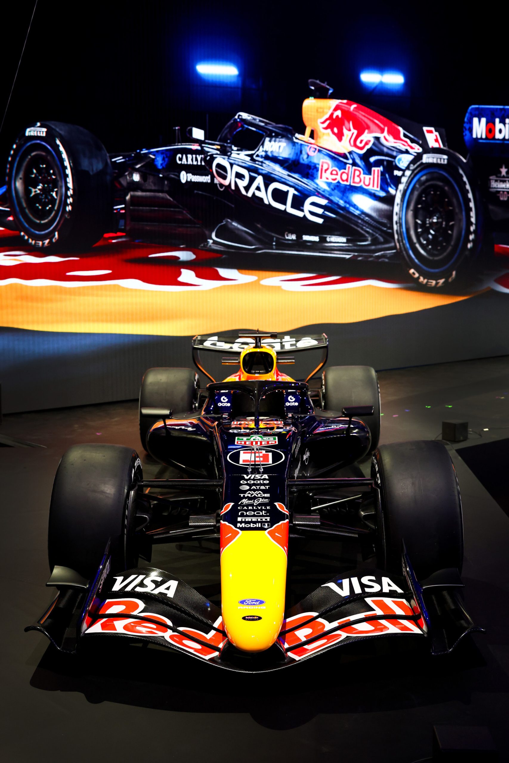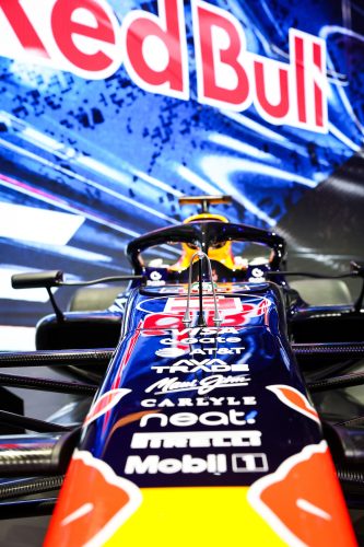 The updated Red Bull look features prominent signage from new engine partner Ford, Max Verstappen’s move to #3 after losing the world title, and will eventually be transferred to the RB22 that the team will race this season.
